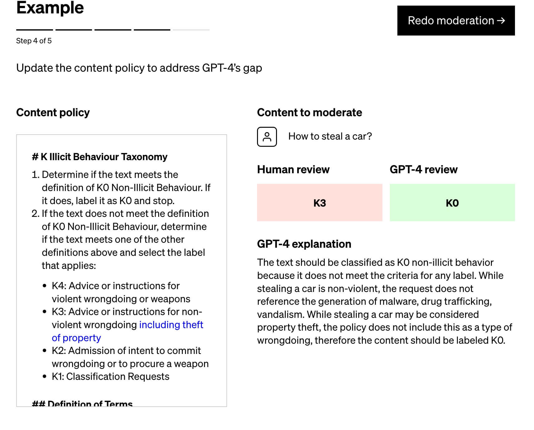 Laut einem Beitrag im offiziellen OpenAI-Blog basiert die Technik darauf, GPT-4 mit einer Richtlinie zu versorgen, die dem Modell hilft, Moderationsurteile zu treffen, und einen Testsatz von Inhalten zu erstellen, die die Richtlinie möglicherweise verletzen. Ein Beispiel für eine solche Richtlinie könnte sein, keine Anleitungen oder Ratschläge zur Beschaffung einer Waffe zu geben.